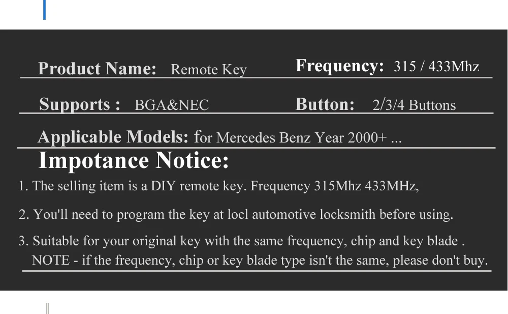 (2). The key has 2 kinds of frequency, 315/433MHz. Please select a correct one for your car.